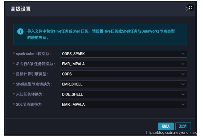 用户可以点击高级设置,设置Azkaban任务与DataWorks任务的转换关系。不同的开源调度引擎,在高级设置里面的设置界面基本一致,如下图: