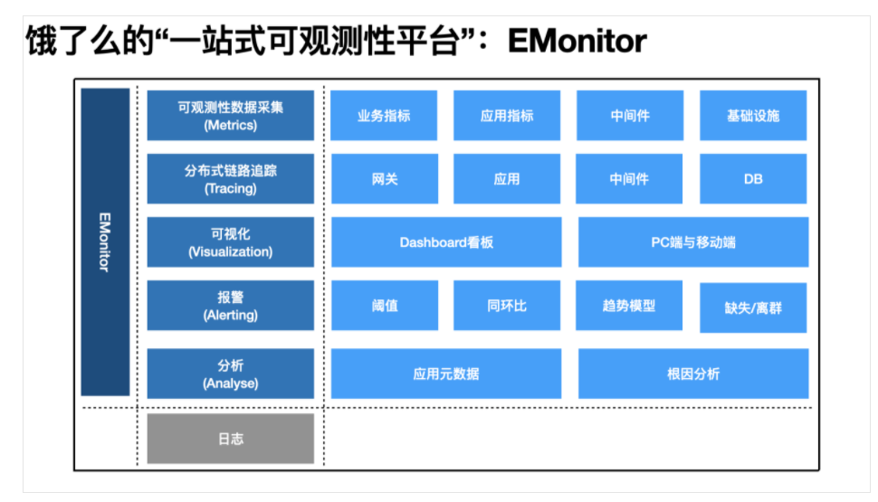 而可观测性作为技术体系的核心环节之一,也跟随饿了么技术的飞速发展,不断自我革新,从“全链路可观测性ETrace”扩展到“多活下的可观测性体系ETrace”,发展成目前“一站式可观测性平台EMonitor”。