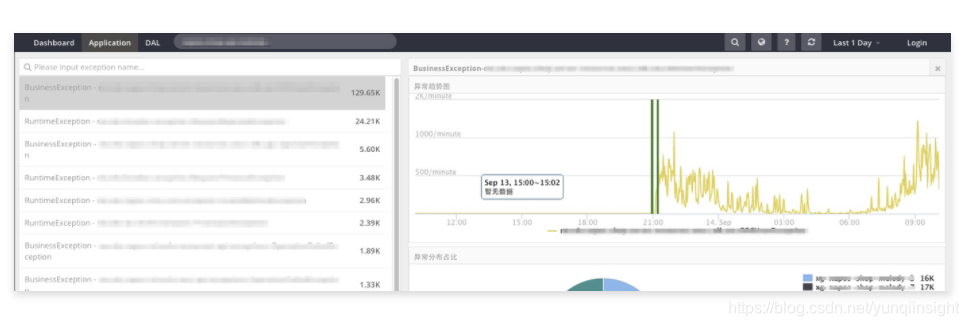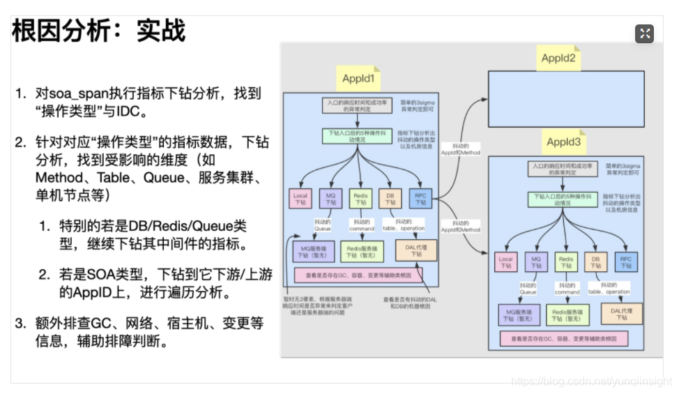 根因分析最大的难点在于:包含复杂维度的指标数据难以找到真正影响数据波动的具体维度;孤立的指标数据也难以分析出应用上下游依赖引起的故障根因。例如,某个应用的异常指标突增,当前我们只能知道突增的异常名、机房维度的异常分布、机器维度的异常分布等,只有用户手工去点击异常指标看来链路之后,才能大致判断是哪个SOA方法/DB请求中的异常。继而用户根据异常链路的环节,去追溯上游或下游的应用,重复类似的排查过程,最后以人工经验判断出故障点。