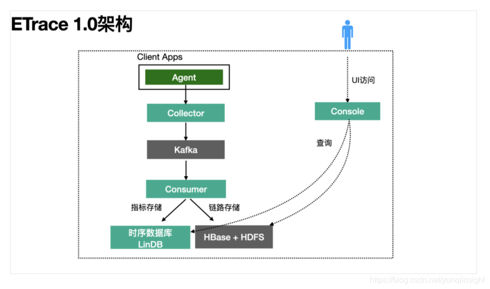 ETrace整体架构如下图。通过SDK集成在用户应用中的Agent定期将Trace数据经Thrift协议发送到Collector(Agent本地不落日志),Collector经初步过滤后将数据打包压缩发往Kafka。Kafka下游的Consumer消费这些Trace数据,一方面将数据写入HBase+HDFS,一方面根据与各中间件约定好的埋点规则,将链路数据计算成指标存储到时间序列数据库-- LinDB中。在用户端,Console服务提供UI及查询指标与链路数据的API,供用户使用。