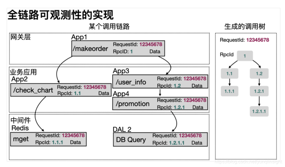 所谓全链路可观测性,即每次业务请求中都有唯一的能够标记这次业务完整的调用链路,我们称这个ID为RequestId。而每次链路上的调用关系,类似于树形结构,我们将每个树节点上用唯一的RpcId标记。