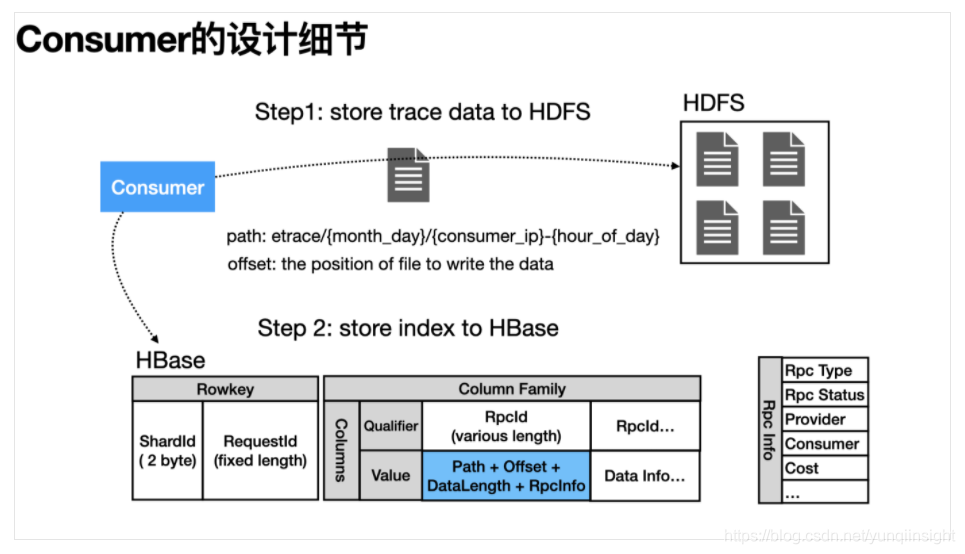 Consumer组件的核心任务就是将链路数据写入存储。主要思路是以RequestId+RpcId作为主键,对应的Data数据写入存储的Payload。再考虑到可观测性场景是写多读少,并且多为文本类型的Data数据可批量压缩打包存储,因此我们设计了基于HDFS+HBase的两层索引机制。