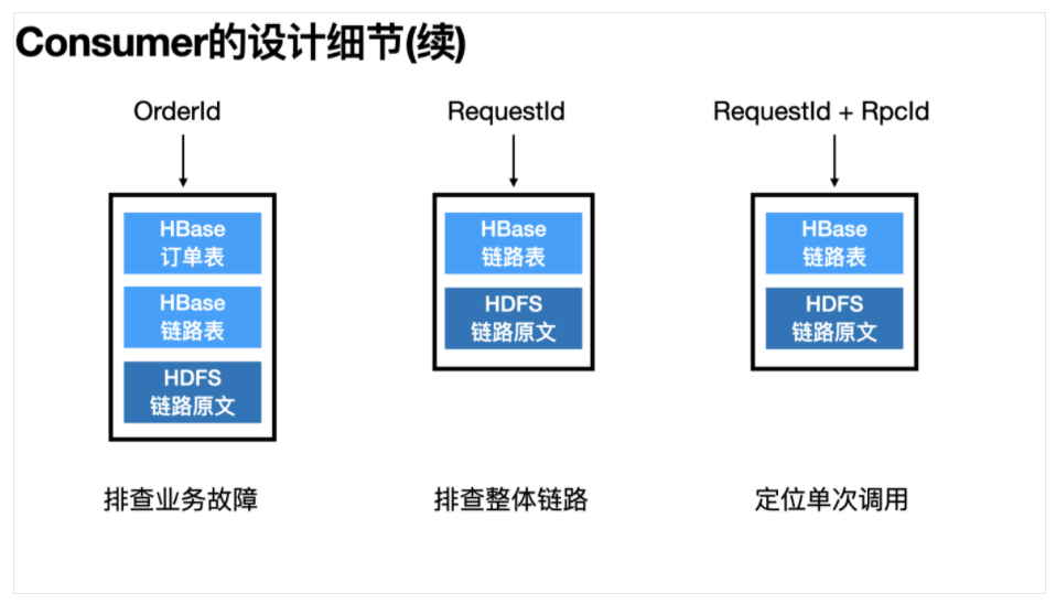 此外,饿了么的场景下,研发团队多以订单号、运单号作为排障的输入,因此我们和业务相关团队约定特殊的埋点规则--在Transaction上记录一个特殊的"orderId={实际订单号}"的Tag--便会在HBase中新写一条“订单表”的记录。该表的设计也不复杂,Rowkey由ShardId与订单号组成,Columne Value部分由对应的RequestId+RpcId及订单基本信息(类似上文的RPCInfo)三部分组成。
