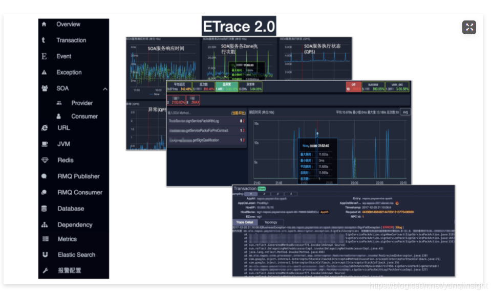 我们可观测性团队,在调研业界主流的全链路可观测性产品--包括著名的开源全链路可观测性产品“CAT”后,吸取众家之所长,在两个多月的爆肝开发后,推出了初代ETrace。我们提供的Java版本ETrace-Agent随着新版的饿了么SOA框架“Pylon”在饿了么研发团队中的推广和普及开来。ETrace-Agent能自动收集应用的SOA调用信息、API调用信息、慢请求、慢SQL、异常信息、机器信息、依赖信息等。下图为1.0版本的ETrace页面截图。