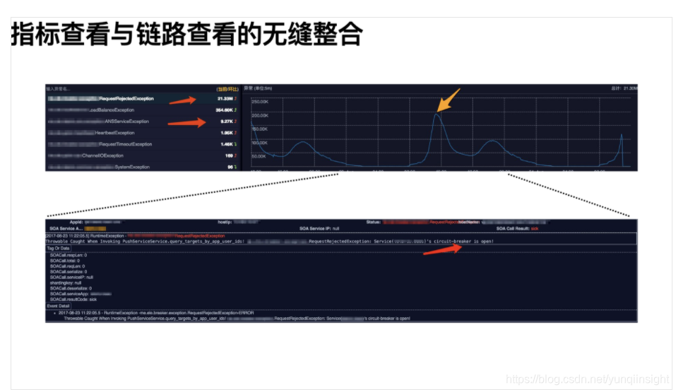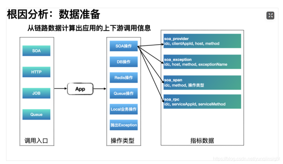 其次,在链路数据计算时,我们就能将额外的上下游附加信息附加到对应的指标之中。如,可在异常指标中追加一个维度来记录产生异常的SOA方法名。这样在根据异常指标分析时,能直接定位到是这个应用的那个SOA方法抛出的异常,接下来“自动”分析是SOA下游故障还是自身故障(DB、Cache、GC等)。