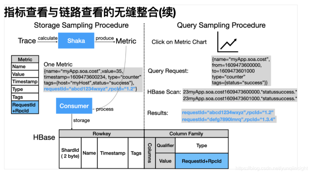 它的实现原理如上图所示。具体的,前文提到的实时计算模块Shaka将Trace数据计算成Metric数据时,会额外以抽样的方式将Trace上的RequsetId与RpcId也写到Metric上(即上文Esper语句中,生成的Metric中的sampling字段)。这种Metric数据会被Consumer模块消费并写入到HBase一张Sampling表中。
