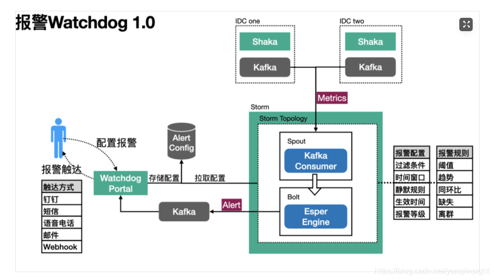 在应用可观测性基本全覆盖之后,报警的需求自然成了题中之义。技术选型上,根据我们在实时计算模块Shaka上收获的经验,决定再造一个基于实时数据的报警系统--Watchdog。