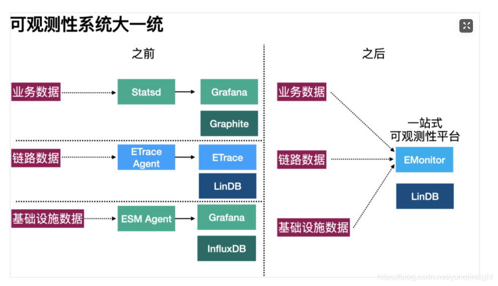 在2017年的饿了么,除了ETrace外还有多套可观测性系统:基于Statsd/Graphite的业务可观测性系统、基于InfluxDB的基础设施可观测性系统。后两者都集成Grafana上,用户可以去查看他的业务或者机器的详细指标。但实际排障场景中,用户还是需要在多套系统间来回切换:根据Grafana上的业务指标感知业务故障,到ETrace上查看具体的SOA/DB故障,再到Grafana上去查看具体机器的网络或磁盘IO指标。虽然,我们也开发了Grafana的插件来集成LinDB的数据源,但因本质上差异巨大的系统架构,还是让用户“疲于奔命”式的来回切换系统,用户难以有统一的可观测性体验。因此2018年初,我们下定决心:将多套可观测性系统合而为一,打通“业务可观测性+应用可观测性+基础设施可观测性”,让ETrace真正成为饿了么的一站式可观测性平台。