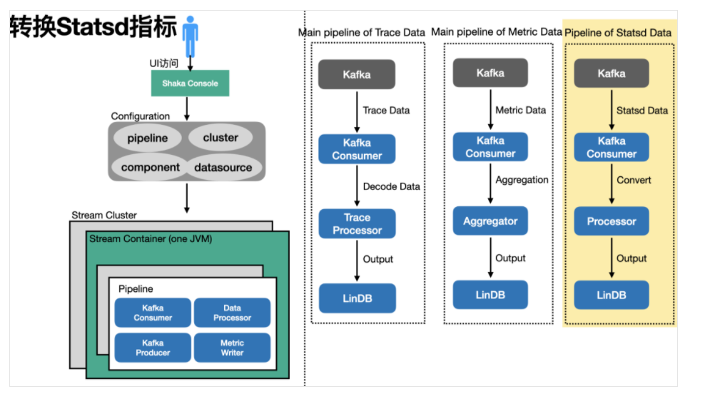 之前我们的实时计算模块Shaka就在这里派上了大用场:只要再新增一路数据处理流程即可。如下图,新增一条Statsd数据的处理Pipeline,并输出结果到LinDB。在用户的代码全部从Statsd API迁移到ETrace API后,这一路处理逻辑即可移除。
