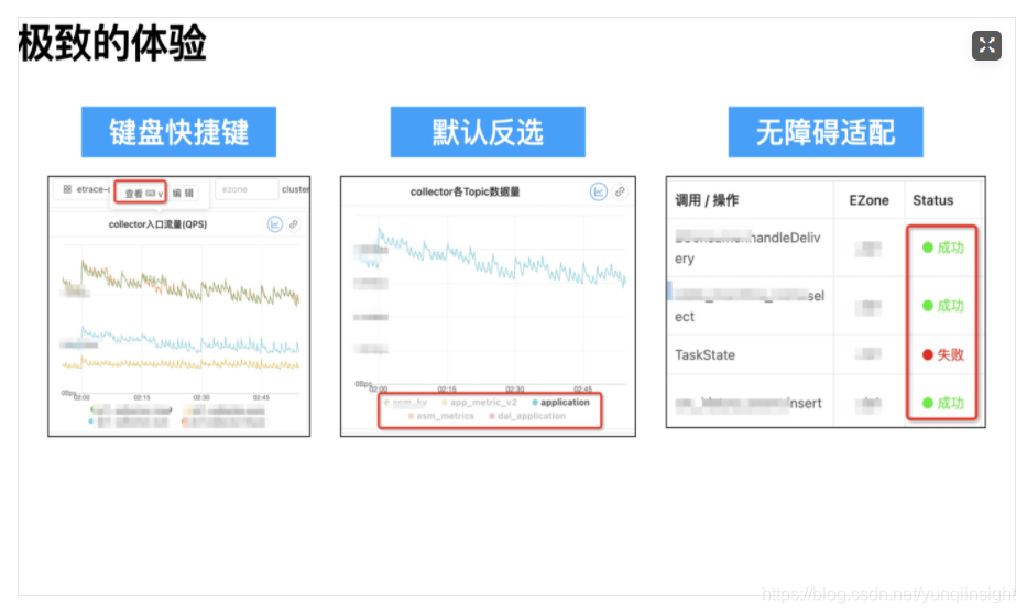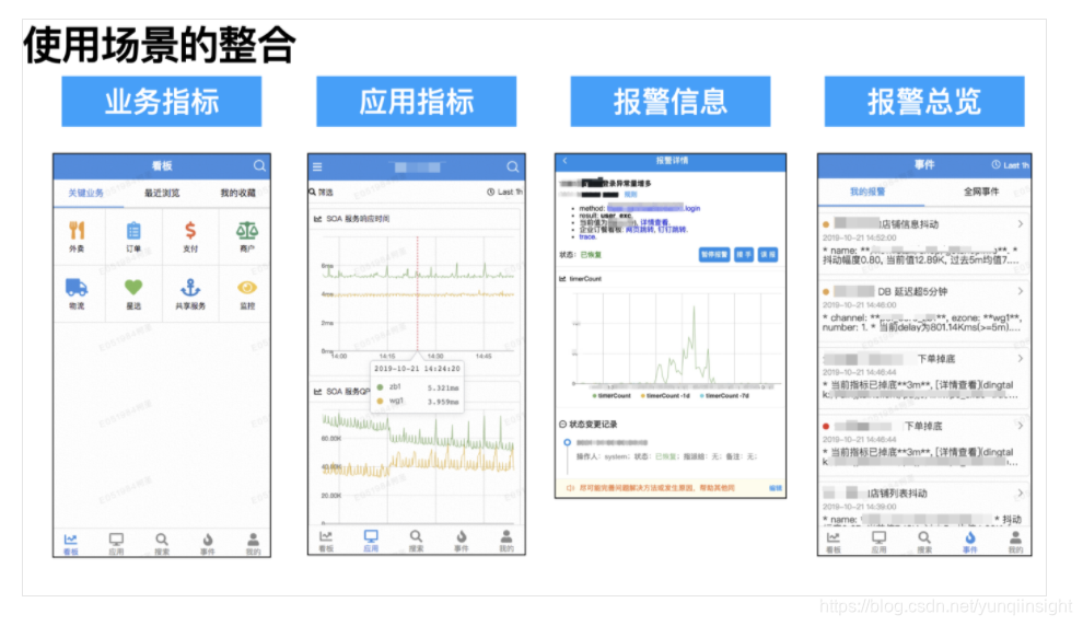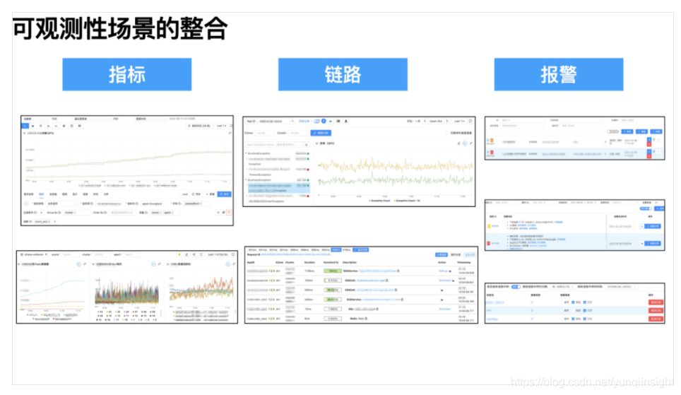 在可观测性场景上,“指标看板”用于日常业务盯屏与宏观业务可观测性,“链路”作为应用排障与微观业务逻辑透出,“报警”则实现可观测性自动化,提高应急响应效率。
