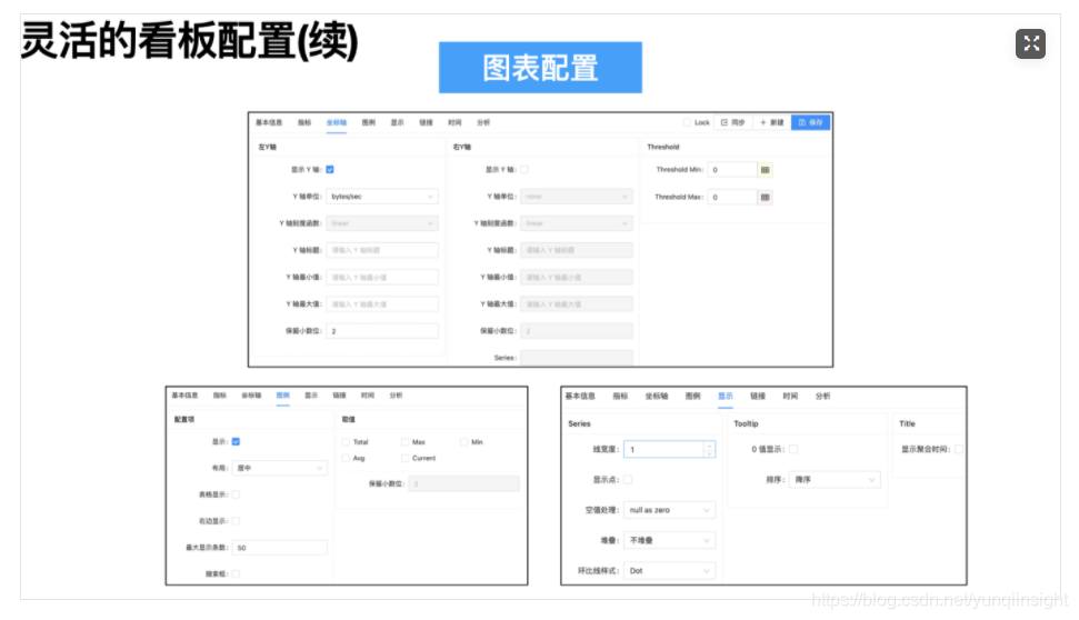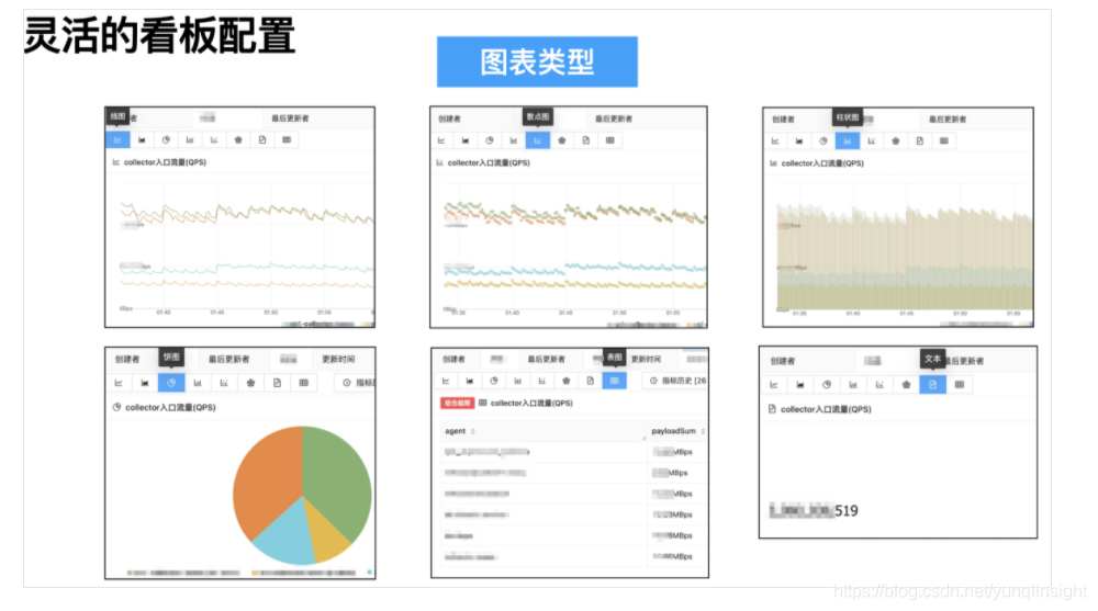 在指标配置上,我们提供了多种图表类型--线图、面积图、散点图、柱状图、饼图、表格、文本等,以及丰富的自定义图表配置项,能满足用户不同数据展示需求。