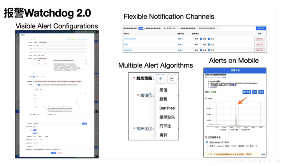 同样在EMonitor之前,亦有Statsd与InfluxDB对应的多套报警系统。用户若想要配置业务报警、链路报警、机器报警,需要辗转多个报警系统之间。各系统的报警的配置规则、触达体验亦是千差万别。Watchdog报警系统也面临着统一融合的挑战。