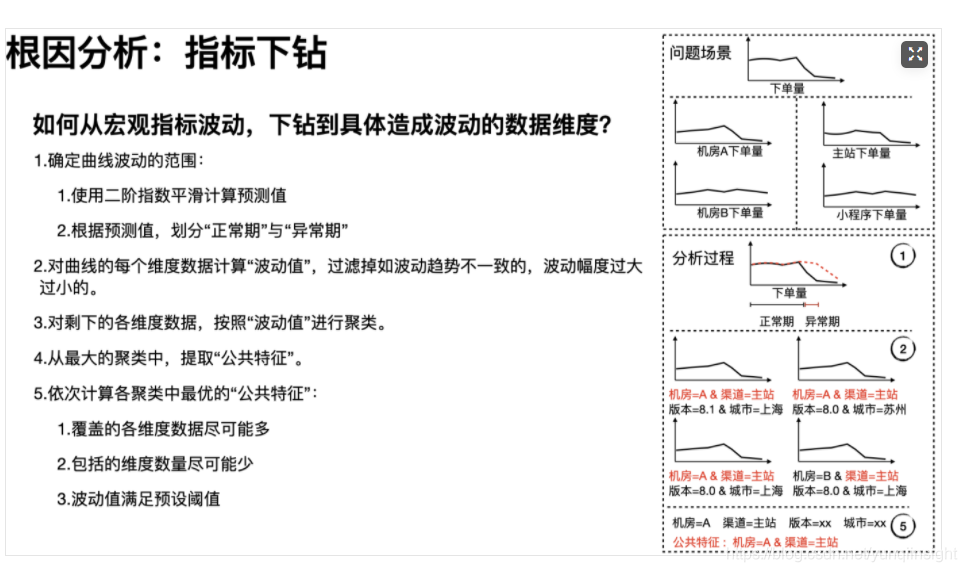 因此,在“指标下钻”上,我们针对目标指标的曲线,细分成最精细的每个维度数据(指标group by待分析的tag维度),使用KMeans聚类找出故障数据的各维度的最大公共特征,依次计算找到最优的公共特征,如此便能找到曲线波动对应的维度信息。