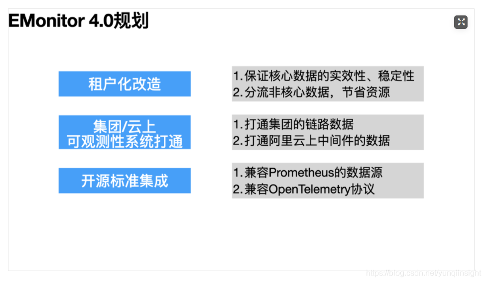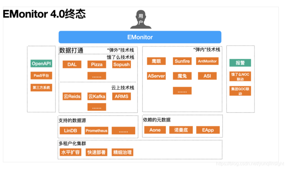 经过4、5年的发展,风云变幻但团队初心不改,为了让用户用好可观测性系统,EMonitor没有停下脚步,自我革新,希望让“天下没有难用的可观测性系统”。我们向集团的可观测性团队请教学习,结合本地生活自己的技术体系建设,力争百尺竿头更进一步,规划了以下的EMonitor 4.0的设计目标。