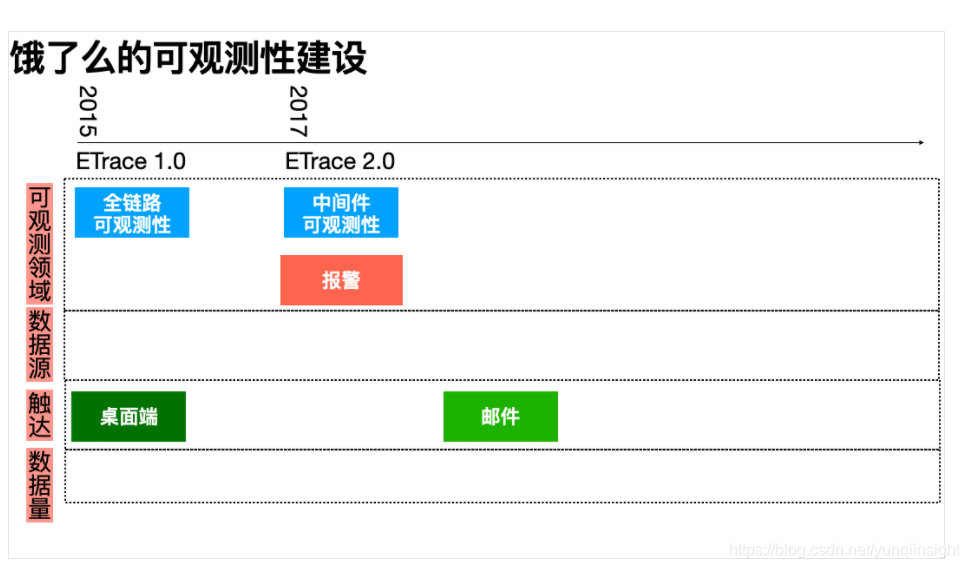 翻看代码提交记录,ETrace项目的第一次提交在2015年10月24日。而2015年,正是饿了么发展的第七个年头,也是饿了么业务、技术、人员开始蓬勃发展的年头。彼时,饿了么的可观测性系统依赖Zabbix、Statsd、Grafana等传统的“轻量级”系统。而“全链路可观测性”正是当时的微服务化技术改造、后端服务Java化等技术发展趋势下的必行之势。