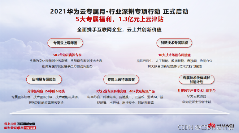 在本次华为云专属月·行业深耕行动中,华为云将聚焦电商、游戏、移动出行三大行业,开展一系列“技术赋能、资源共享、成长加速”等活动与宣传,通过推出“专属云上导师团、创新技术专属赋能、启明星专属服务、专属上月特惠套餐、专属技术伙伴成长加速计划”5大专属福利,1.3亿元上云津贴,40+优选场景上云专属优惠套餐,持续投入资金、技术力量、生态力量,全面服务好互联网客户与开发者。