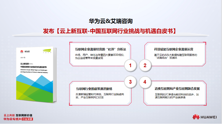 发布会上,华为云联合艾瑞发布了《2021互联网行业挑战与机遇白皮书》。文件中探讨了目前互联网企业在流量竞争中面临的主要问题并向互联网企业提出建议,以期能够帮助互联网企业在不断变化的市场格局中不断优化自身经营策略。