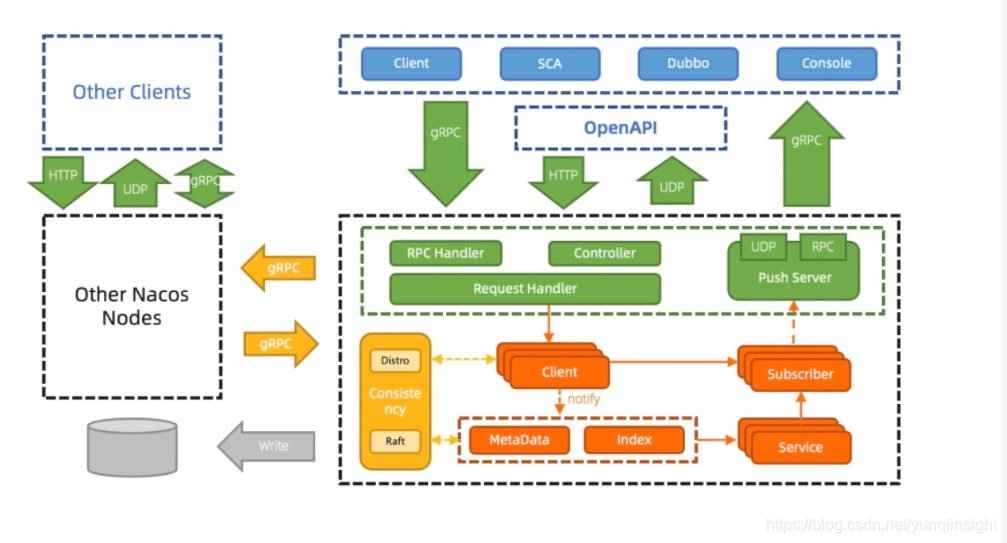 Nacos2架构下的服务发现,客户端通过Grpc,发起注册服务或订阅服务的请求。服务端使用Client对象来记录该客户端使用Grpc连接发布了哪些服务,又订阅了哪些服务,并将该Client进行服务间同步。由于实际的使用习惯是服务到客户端的映射,即服务下有哪些客户端实例;因此2.0的服务端会通过构建索引和元数据,快速生成类似1.X中的Service信息,并将Service的数据通过Grpc Stream进行推送。