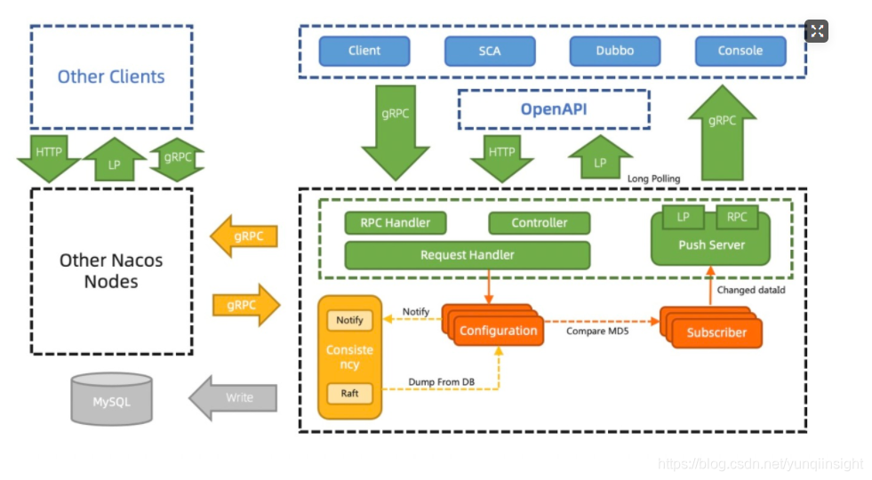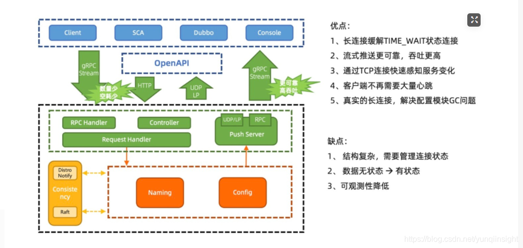 配置管理之前用Http1.1的Keep Alive模式30s发一个心跳模拟长链接,协议难以理解,内存消耗大,推送性能弱,因此2.0通过gRPC彻底解决这些问题,内存消耗大量降低。