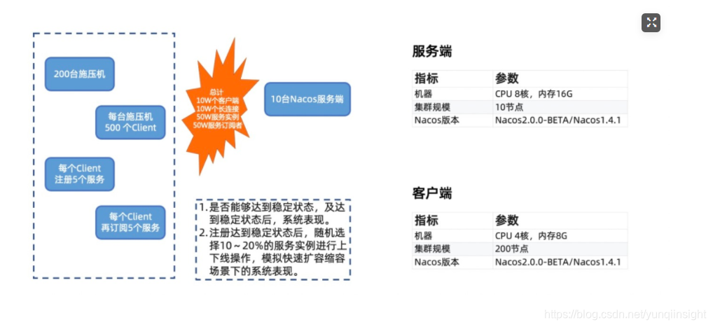 服务发现场景我们主要关注客户端数,服务数实例数,及服务订阅者数在大规模场景下,服务端在推送及稳定状态时的性能表现。同时还关注在有大量服务在进行上下线时,系统的性能表现。