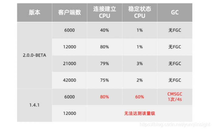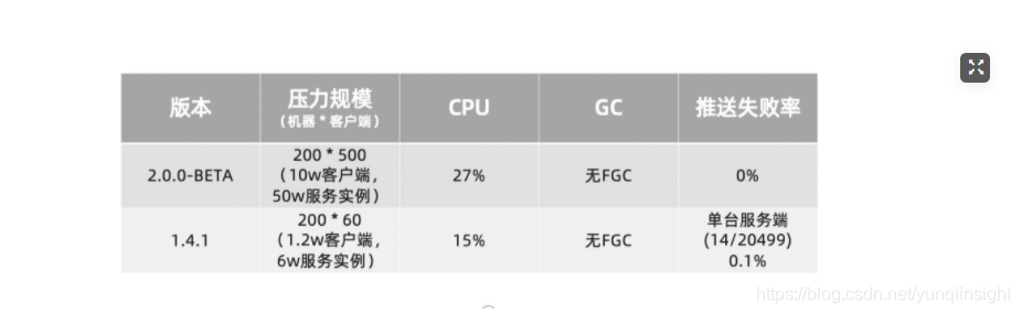 反观1.X版本,在10W、5W级客户端下,服务端完全处于Full GC状态,推送完全失败,集群不可用;在2W客户端规模下,虽然服务端运行状态正常,但由于心跳处理不及时,大量服务在摘除和注册阶段反复进行,因此达不到稳定状态,CPU一直很高。1.2W客户端规模下,可以稳定运行,但稳态时CPU消耗是更大规模下2.0的3倍以上。