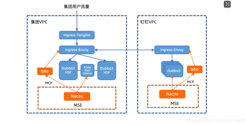 用户流量从北向进入集团的VPC网络中,先通过一个统一接入Ingress-Tengine网关,他可以将域名解析并路由到不同的机房,单元等。本周我们也同步更新了 Tengine 2.3.3 版本,内核升级到Nginx Core 1.18.0 ,支持Dubbo协议 ,支持DTLSv1和DTLSv1.2,支持Prometheus格式,从而提升阿里云微服务生态完整性、安全性、可观测性。
