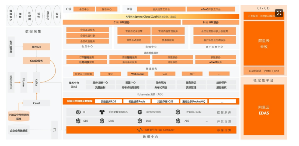 - 业务+数据双中台架构,双中台闭环,实现“千人千面”精准营销和全生命周期会员闭环运营。