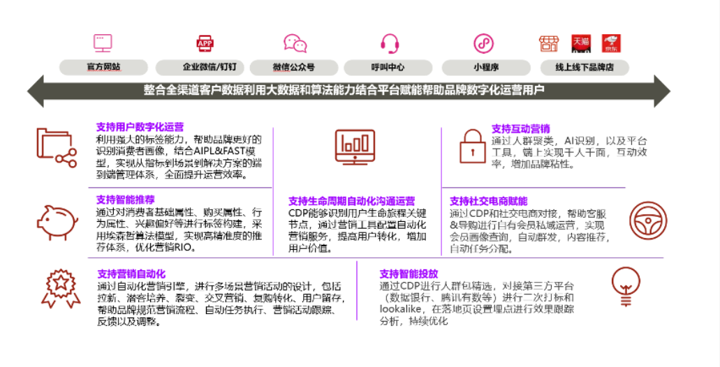 全渠道客户统一标识解决方案通过One-ID来实现客户跨渠道的身份识别与匹配,并且通过标签工厂提供强大的自定义标签能力,构建360度客户画像。全域数字化营销平台采集用户行为数据、客户基本信息及交易等业务数据,支撑营销营销活动的完整业务闭环。同时平台也具备完全开放的能力,对一方、三方的行为数据进行数据采集并利用,对营销活动进行指导,也可与开放APIs的第三方平台进行集成,多渠道触达客户。