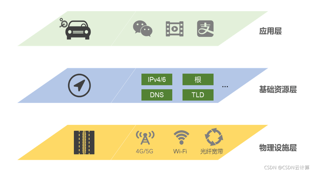 回溯传统的互联网技术产业格局,从互联网诞生之初就确立了“三层架构”,即:物理设施层、基础资源层、应用层。物理设施层是由计算、存储、网络构建的有线和无线网络,好比信息高速公路;应用层是金融、政务、购物、娱乐、搜索、社交等基于互联网的各种应用,就像跑在高速公路上的汽车。中国的汽车在中国的公路上行驶,为什么还会有断网的危险?因为两层中间还有一层基础资源层,由域名系统和IP地址组成的寻址解析系统好比导航系统,导航一旦失效就会断网。由于根服务器、顶级域名等关键基础设施就在这一层,也把这一层比做『网络根基』。