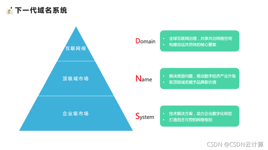 2.Name,『名 』是指资源:过去用户只能申请二级域名注册,新顶级域名的启动,开启了全球互联网空间资源发展的新契机。企业和机构可以申请运行类似.com这样的顶级域名。这是全球核心资源的再分配。要在规则制定、平台建设、技术标准等方面做好充足准备,为数字经济的发展、新基建的建设储备优质资源。