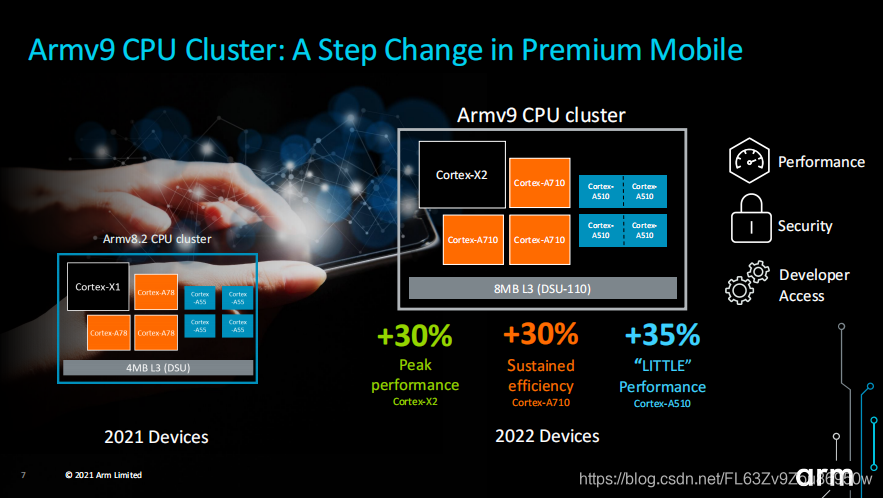 - Cortex-A710是首款基于 Armv9 架构的大核 CPU,与 Cortex-A78 相比,能效提升 30% ,性能提升 10%;