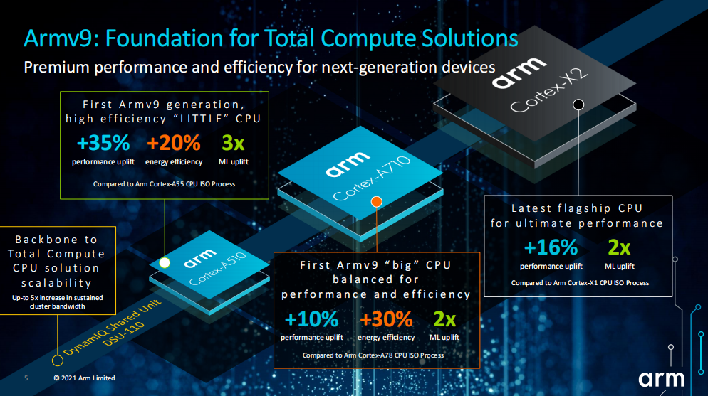 2021年5月25日晚,Arm发布了针对移动端的Armv9体系新架构,除了公布首款全面计算(Total Compute)解决方案,Arm还发布了首批基于Armv9 架构的Cortex-A CPU,为消费电子视觉体验而设计的Mali-G GPU系列,以及与之适配的系统 IP CoreLink 700。