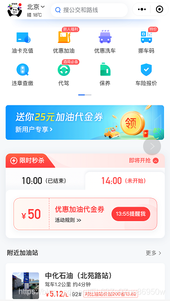 “出行服务”主要包含两大服务页面,“车生活”和“公交地铁”。“车生活”服务页面专为驾车用户设置,涵盖加油、洗车、挪车码、违章查询、代驾、保养、车险报价、驾车通勤路线规划、道路救援、充电桩、驾照翻译、换轮胎、租车等服务。此外,用户在“添加爱车”入口添加车辆信息绑定小程序后,即可进行违章查缴、记录油耗、车辆年检提示等操作,“车主提醒”板块还贴心设置了“油价变动提醒”和“摇号结果通知”等服务。