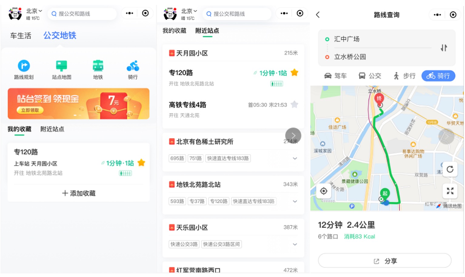 “公交地铁”板块囊括了实时公交、乘车码“刷码乘车”、路线规划等功能。通过实时公交功能,用户可一键查询附近的站点、公交到站情况及首末班车发车时间等信息,还可以收藏常用的路线,合理制定出行方案,提高出行效率和体验。