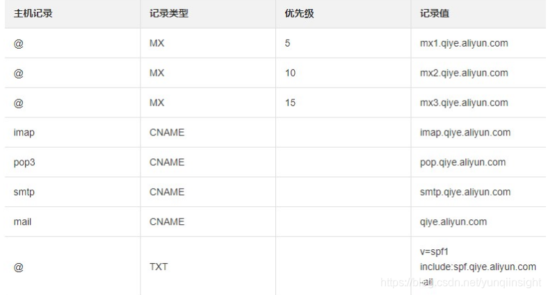 1 . 联系邮箱提供商,获取邮箱解析需要配置的解析记录。以阿里云邮箱做示意,下方是阿里云邮箱需要配置的解析记录列表。