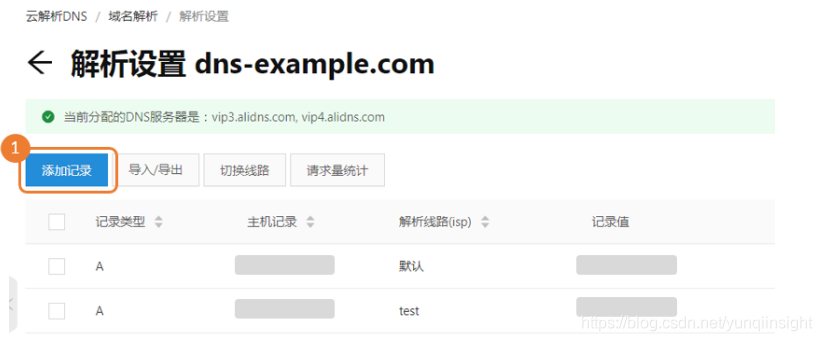 3 . 在域名解析页面,全部域名页签下,点击 域名,进入解析设置页面,点击 添加记录 按钮。