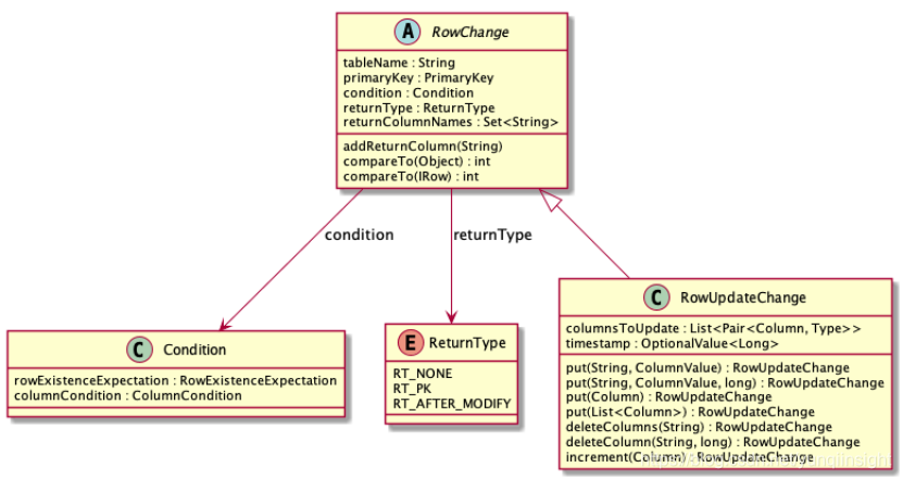 | RowChange(基类) | RowUpdateChange的基类,提供了设置表名、主键、更新条件、返回类型等通用参数。 | tableName | 指定本次更新要操作的表名。 |