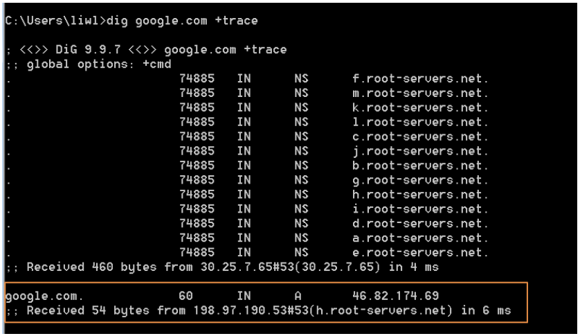 您也可以通过命令dig+trace测试,本地DNS向根DNS服务器查询时,直接返回了IP地址,则一般可判断为在DNS查询在根DNS服务器处就被阻断。