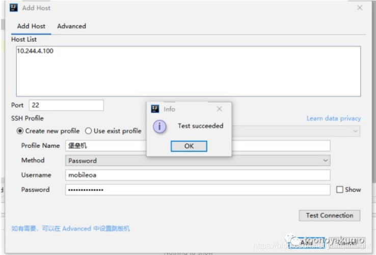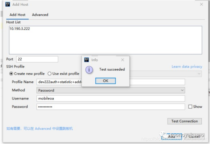 记得测试下连接,点击 add ,然后配置目标机器的信息