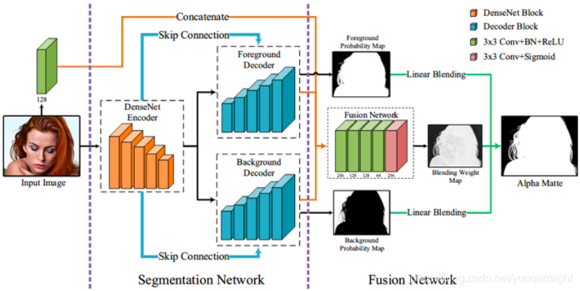 融合网络:由数个连续卷积层构成,它负责预测混合权重。注意,在图像的实心区域,像素的前背景预测往往容易满足