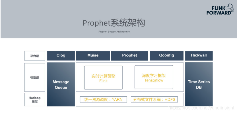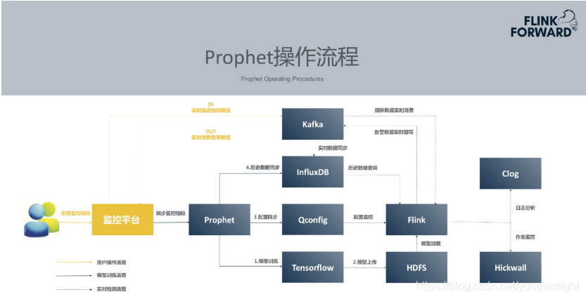 - 引擎层:首先数据必须实时存在于消息队列当中,Prophet使用的是Kafka。此外,Prophet使用Flink计算引擎实现实时异常预警,使用TensorFlow作为深度学习模型的训练引擎。同时Prophet基于时序数据库存储历史数据。