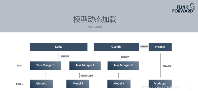 模型训练完成后,Flink作业需要动态加载模型。但实际场景下,不可能每训练一个模型便重启一次Flink作业。所以Prophet平台将模型训练完成后上传到HDFS,通知配置中心,然后Flink作业开始从HDFS上拉取模型。为了使每个模型均匀分布在不同的Task Manager上面,所有监控指标会根据本身id做keyBy,均匀分布在不同的Task Manager上。每个Task Manager只加载自己部分的模型,以此降低资源消耗。