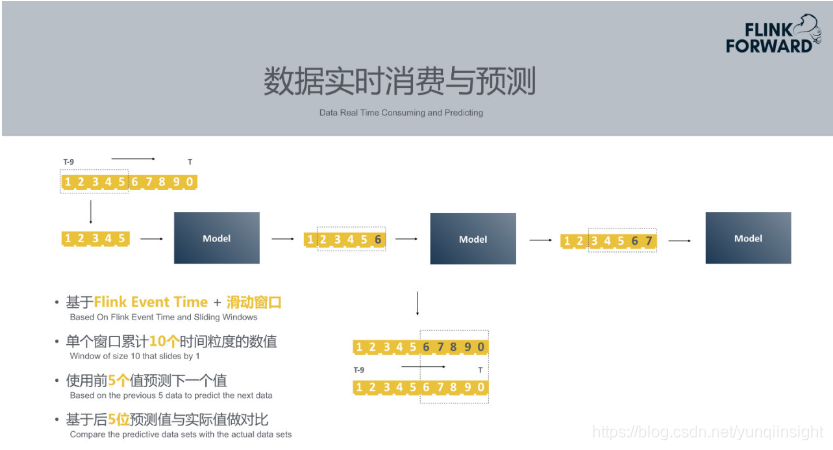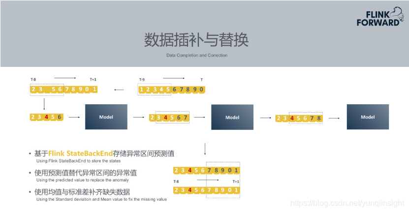 实际场景下往往会出现意想不到的情况。例如上述10分钟的场景中只获得了9条数据,缺少第4个时刻的数据, Prophet会使用均值标准差补齐此类缺失数据。另外如果在上一个时刻检测到第6、7、8、9、10时间区间是异常区间,发生了下跌或者上升。那么此区间的数据被认为是不正常的,不能作为模型输入。此时需要用上一批次模型预测出的第6时刻的值替换原始的第六个时间粒度的值。第2、3、4、5、6这五个时刻值中第4是插补而来的,第6是时间区间训练出来的预测预测值替换掉了异常值。以插补替换之后的值作为模型输入,得到新的预测值7。再依次进行预测。中间过程中异常区间第6、7、8、9、10时刻的预测值需要作为一个状态来存储到Flink StateBackend,后续窗口会使用到这些预测值。