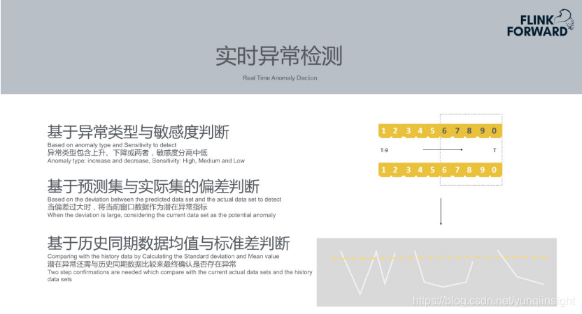 模型加载完成后需要做实时异常检测。首先从Kafka消息队列中消费实时数据。Prophet目前基于Flink Event Time+滑动窗口。监控指标的时间粒度可以分为很多种,如1分钟一个点、5分钟一个点、10分钟一个点等等。例如基于1分钟一个点的场景来看,在Flink作业中开一个窗口,其长度是十个时间粒度,即十分钟。当积累到十条数据时,用前五个数据预测下一个数据,即通过第1、2、3、4、5五个时刻的数据去预测第六个时刻的数据,然后用第2、3、4、5、6时刻的数据预测第七个时刻的数据。最终获得第6、7、8、9、10五个时刻的预测值和实际值。再利用预测值与实际值进行对比。以上是数据无异常的理想场景下的情况。