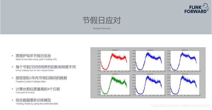 节假日应对手段:不同的场景会导致不同的问题,所以Prophet针对节假日场景做了一些特殊处理。首先,维护每年节假日信息表,程序一旦发现下一个节假日还有一个星期时,Prophet就会提取出过去两年内的不同节假日期间的数据。然后计算前两年的不同节假日和当前节假日数值的相似度来匹配。相当于以当前节假日的数据拟合过去节假日的数据,拟合到某个时间段时,就知道大概从某个时间开始到某个时间结束是和当前趋势类似的。然后会用过去多个节假日的数据作为一个组合作为新模型的数据输入去训练数据集。不同节假日的占比不同,通过一些方式计算出不同占比值。最终相基于组合的数据集训练出新的模型,新的模型可以比较好地预测出某一个指标或者某一个业务在节假期七天之内的趋势。