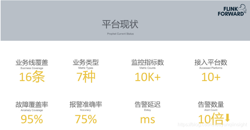 Prophet基本覆盖了携程所有业务线。即携程的重要业务指标基本都已经在使用监控智能告警。业务类型包含7种。监控指标的数量达到10K+,覆盖了携程所有订单、支付等重要的业务指标,覆盖了大部分服务的重要的业务指标。接入平台在10+左右,基本接入了携程公司所有系统级别的监控平台,在陆续接入各个业务部门自己的监控平台。Prophet平台能够覆盖95%左右的异常,准确报警率达到75%。因为每个数据同步到Prophet便触发数据实时消费、预测以及告警,告警延迟达到ms级别。告警数量也下降了十倍左右。