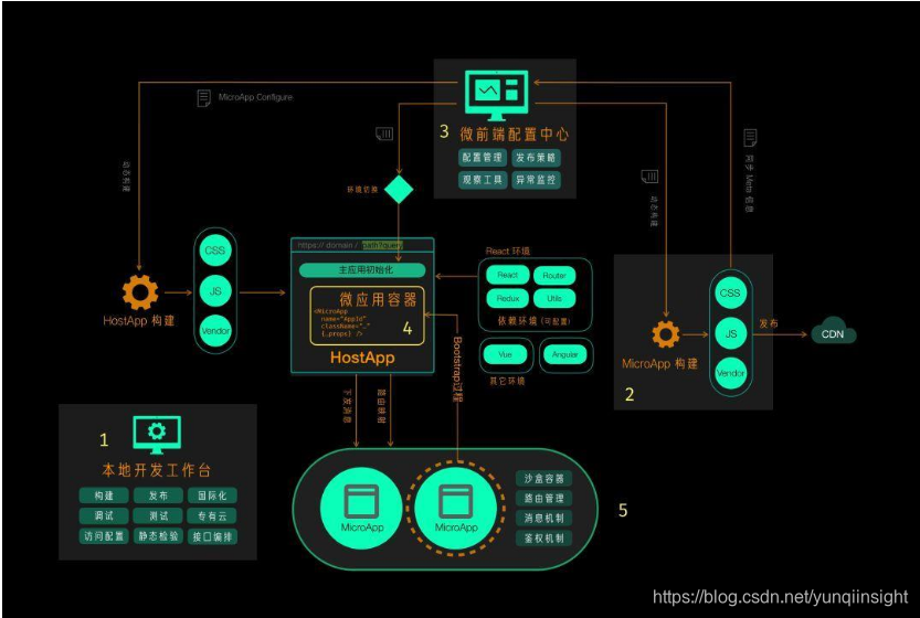 通过上图,很明显的看出前后端分工,以及线上微应用相关配置流程。整体运行环境以及开发流程是非常复杂的,留到大会的时候再详细讲解。