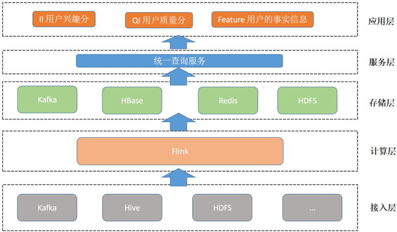 - 应用层:以统一查询服务对各个业务线数据场景进行支撑。目前业务主要包含用户兴趣分、用户质量分、用户的事实信息等数据。