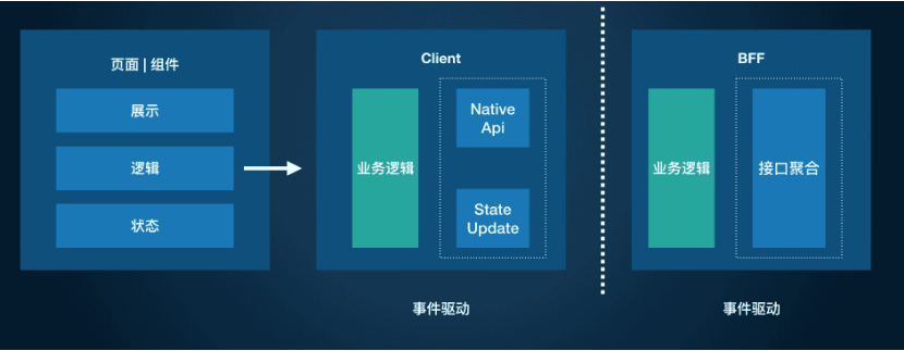 在传统的开发模型下,页面逻辑、状态、展示三者之间的流转是在端侧进行的,后端负责了一部分的逻辑处理(通常这部分逻辑是需要对于各种领域接口进行调用)。
