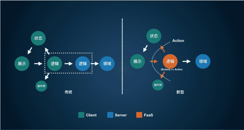 这个意图最终会产生什么样的UI变化,FaaS会通过一个state change或者native api形式的Action直接调用到具体的实现函数去。